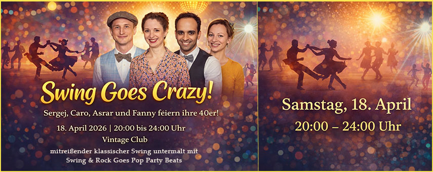 Vier runde Geburtstage, eine große Party: Sergej, Caro, Asrar und Fanny werden 40 – und das wird gefeiert! (Sergej hat genau am 18.4. Geburtstag!). Euch erwartet ein abwechslungsreicher Abend voller mitreißender Swing-Musik, ergänzt durch energiegeladene Partyhits im Stil von Swing & Rock Goes Pop von 20:00 bis 24:00 Uhr. Eintritt 10 Euro |